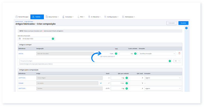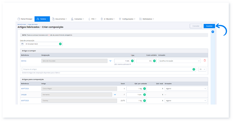 Após ter criado o artigo de composição, deve proceder ao seu fabrico.