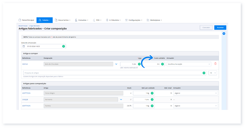 5. Insira o Custo unitário, selecione o Armazém de destino do artigo, e os armazéns de origem de cada artigo associado. Caso o artigo contenha um armazém predefinido é automaticamente associado.