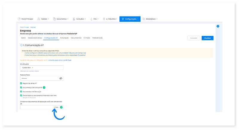 Por defeito todas as empresas comunicam os documentos em tempo real, mas caso altere essa configuração, os seus documentos só serão comunicados passados esses dias que selecionou na configuração, a partir da data do documento.