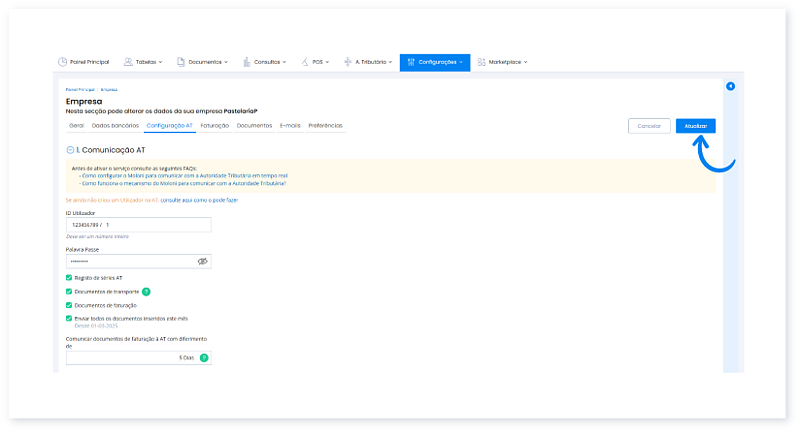 Este procedimento não requer qualquer intervenção da sua parte, a não ser a configuração da opção e sempre que um documento de débito ou crédito for emitido, o mesmo é comunicado à Autoridade Tributária em tempo real.