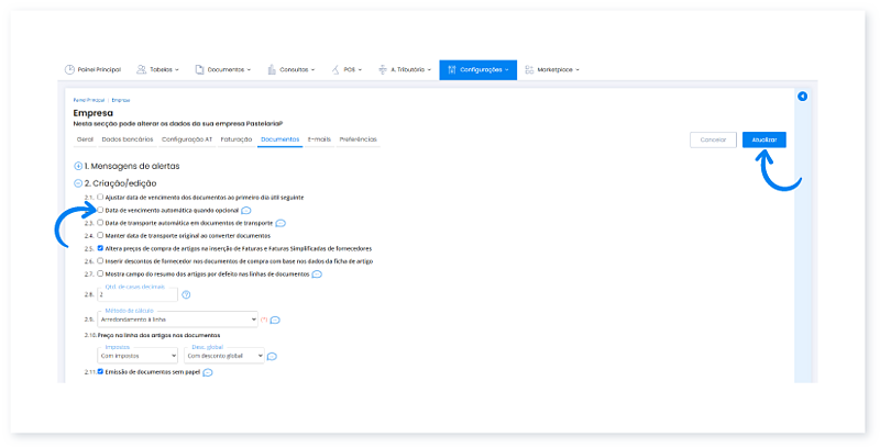 3. Encontra a opção Data de vencimento automática quando opcional. Desative-a para que a data de vencimento deixe de ser preenchida automaticamente nos documentos acima listados. Clique Atualizar para guardar a alteração.