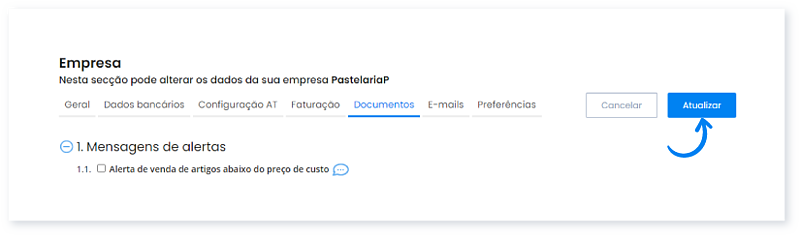 Por defeito este alerta encontra-se inativo, sendo necessário aceder às Configurações da sua empresa para o ativar.
