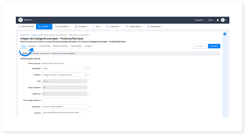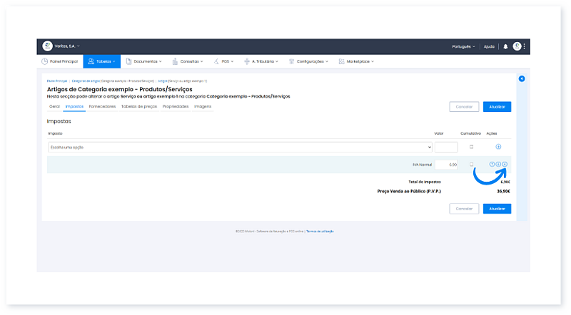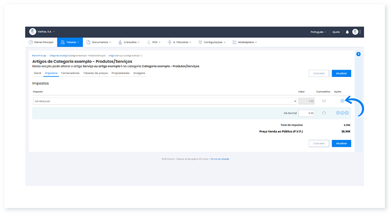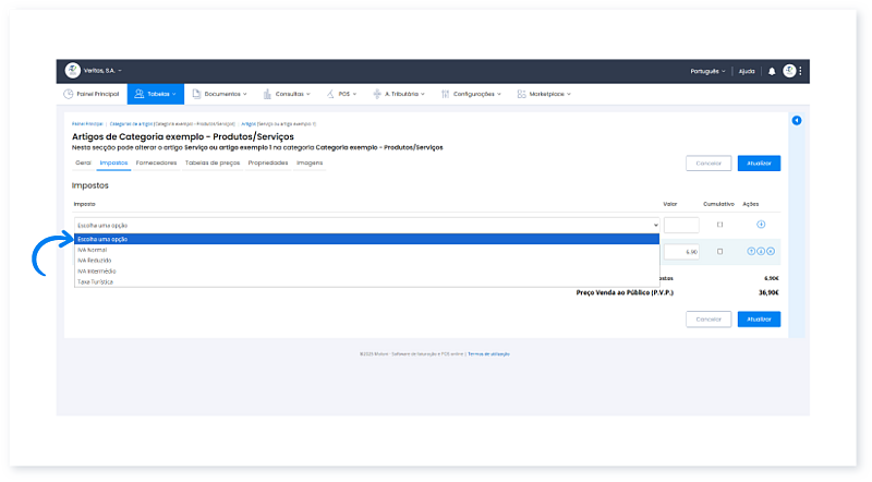 Antes de começar: O Artigo deve estar criado e o Imposto configurado. Pode associar o imposto diretamente ao criar o artigo, ou mais tarde, ao editar um artigo já existente.