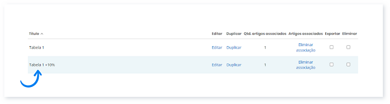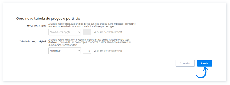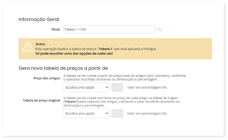 Esta funcionalidade permite criar uma nova tabela que é aplicada automaticamente a todos os artigos que têm a tabela de origem associada.