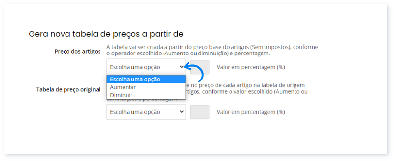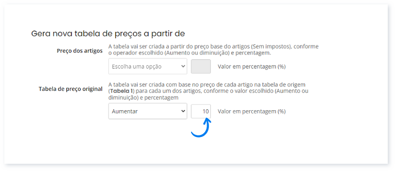 Imagine, por exemplo, que escolhe aumentar 5%. Isto significa que, sempre que o artigo tiver esta tabela aplicada, o valor de referência da tabela resulta de um aumento 5% sobre o preço base do artigo.