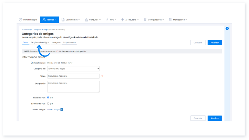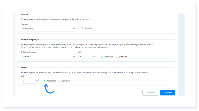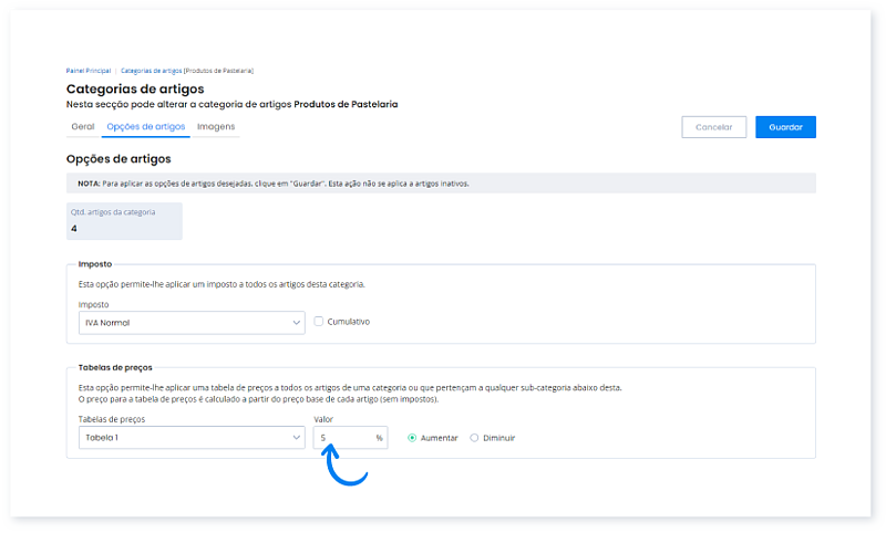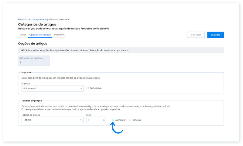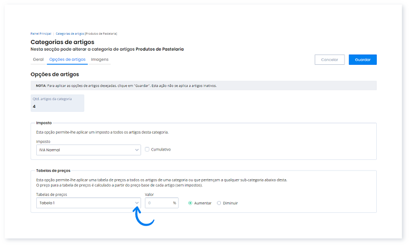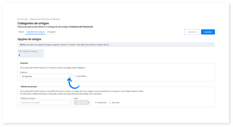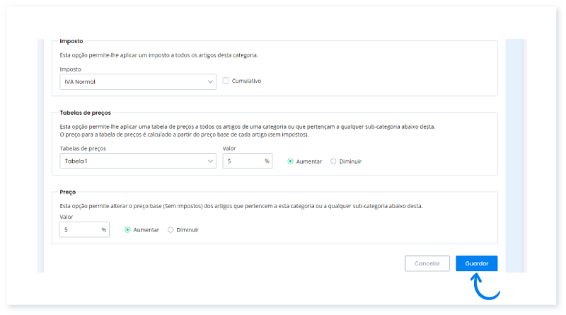 Assim, é possível definir um preço, um imposto e uma tabela de preços para todos os artigos de uma categoria e respetivas subcategorias.
