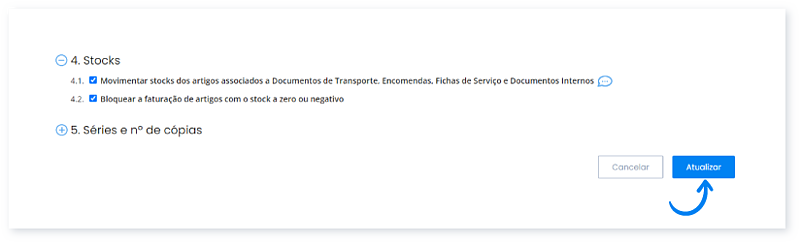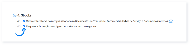 3. Ative o campo Bloquear a faturação de artigos com o stock a zero ou negativo.