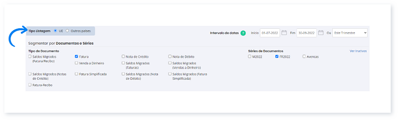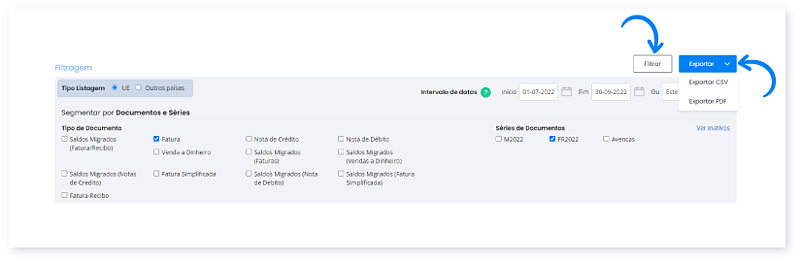 A listagem, que pode ser exportada para o formato CSV e PDF, pode ser segmentada por datas, tipos de documentos e séries, bem como escolher se pretende as vendas para a UE - União Europeia ou Resto do Mundo.