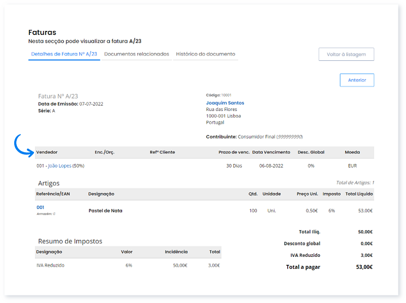 4. Sempre que selecionar um vendedor num documento de venda, este aparece na visualização do documento e no documento impresso em PDF.