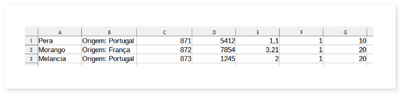 Estes ficheiros podem ser criados a partir de qualquer software de Folha de Cálculo, sendo os mais conhecidos Microsoft Excel e o OpenOffice Calc. Para criar um ficheiro nestes programas, cada linha irá corresponder a um registo diferente, sendo que deve colocar cada valor numa célula diferente, como pode verificar na imagem.