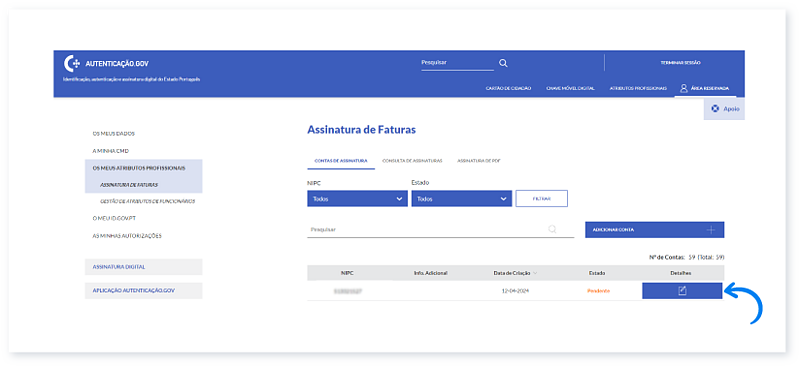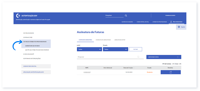 4. No menu lateral, aceda a Os meus Atributos Profissionais e clique em Assinatura de Faturas.