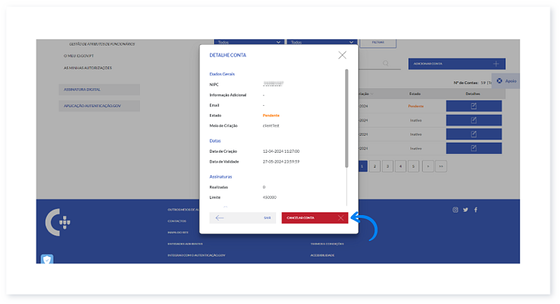 5. Nesta página encontra a listagem de todos os certificados existentes. Deve aceder aos detalhes do certificado associado à sua empresa, dando um clique no botão azul na coluna Detalhes. Este certificado deve encontrar-se no estado Pendente.