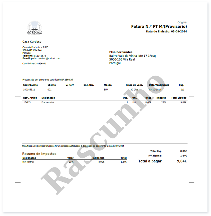 Não deve usar nem enviar estes documentos aos seus clientes, uma vez que não têm qualquer valor fiscal nem legal, sendo que esta funcionalidade apenas deve ser usada para pré-visualizar os documentos.