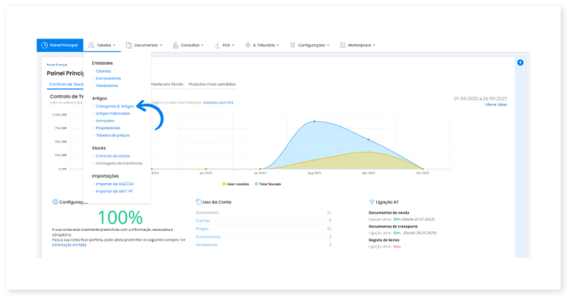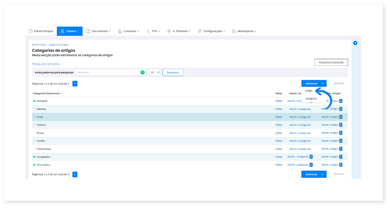 1. Na Área de Cliente, no menu Tabelas, selecione Categorias & Artigos.