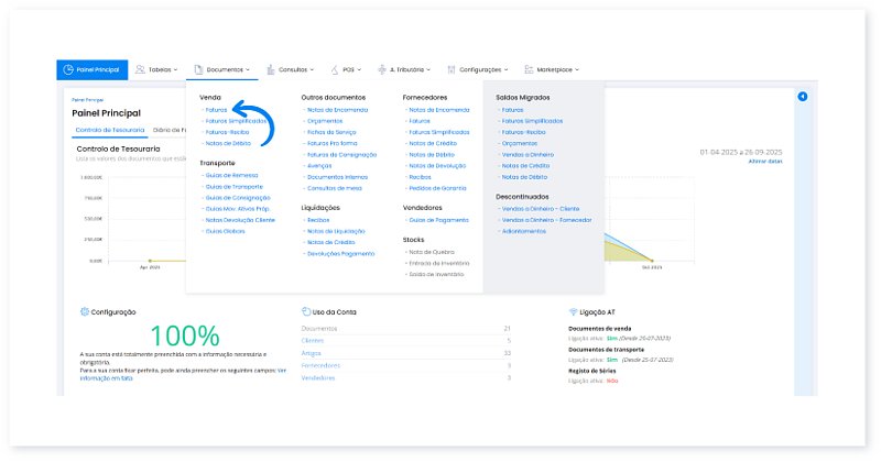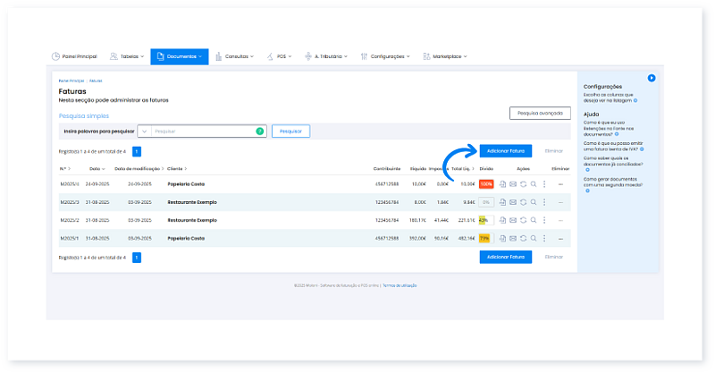 9. Para aplicar a Taxa Turística num documento, selecione Faturas, no menu Documentos.