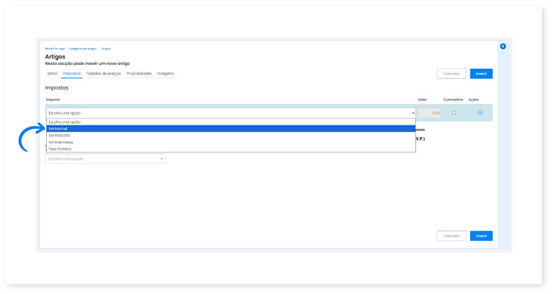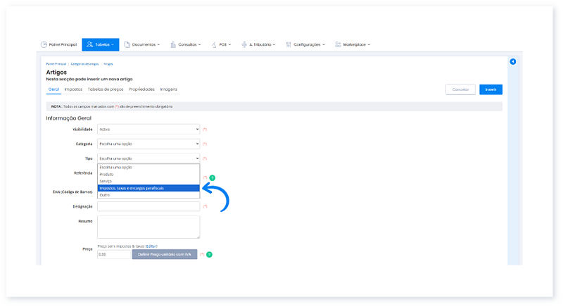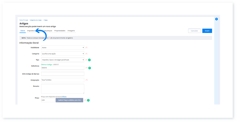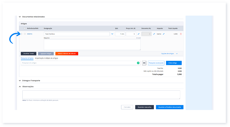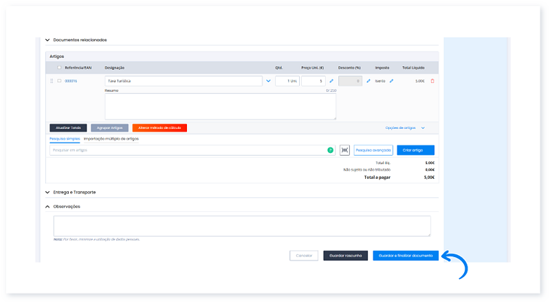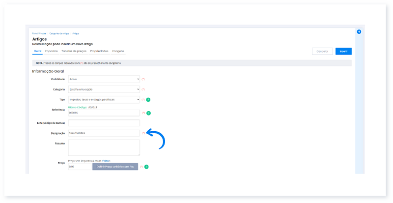 11. De seguida, preencha todos os dados solicitados e adicione o artigo Taxa Turística.