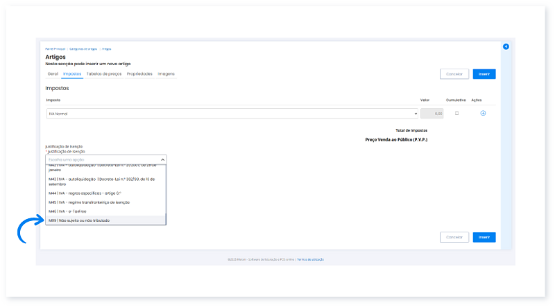 7. Na Justificação de Isenção, selecione a opção M99 | Não sujeito ou não tributado, já que se trata de uma cobrança excluída do regime de IVA, por não sujeição.