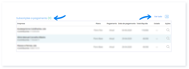 2. Na secção Subscrições a Pagamento encontra uma lista de pagamentos que se encontram pendentes. Nesta área consegue visualizar os mais recentes (3 últimos). Ao clicar em Ver tudo consegue ver uma listagem completa de todas as comissões a pagamento.