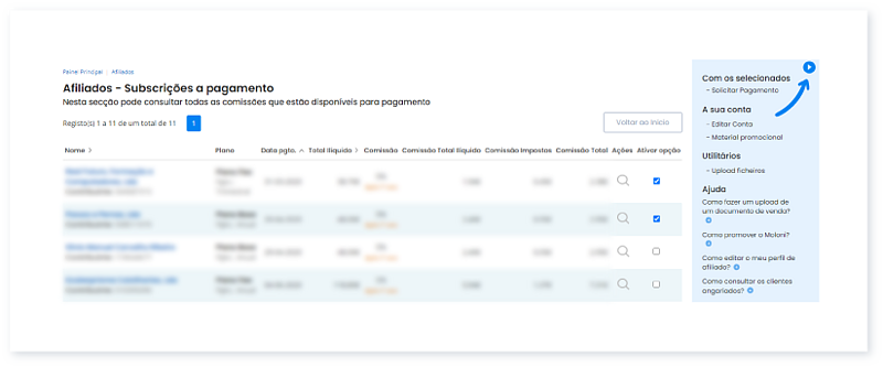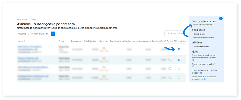 3. Neste painel ative as comissões das quais deseja receber o pagamento. Ative cada uma delas na coluna Ativar Opção, e clique em Solicitar Pagamento, situado na secção Com os selecionados, no lado direito da listagem.