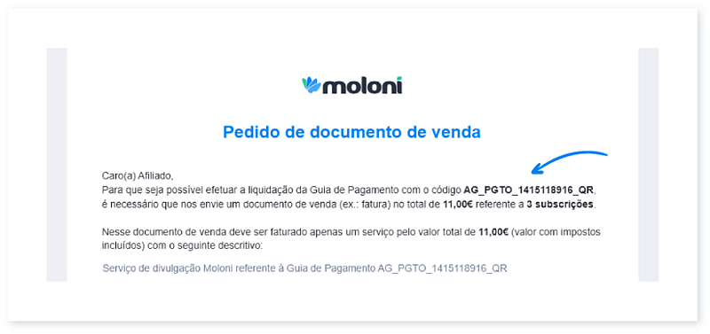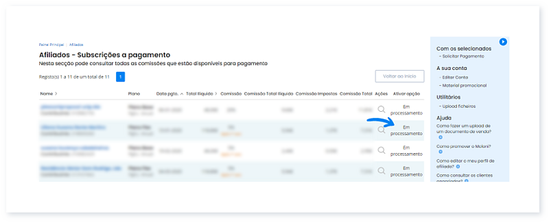 5. Ao aceder à listagem pode encontrar a informação Em processamento nas comissões em que efetuou o pedido, recebendo depois um e-mail do Moloni a confirmar a operação.
