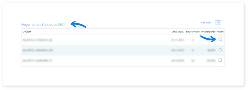 7. Na secção Pagamentos Efetuados pode visualizar o seu pedido através do código da Guia de Pagamento. Clique em Ações para visualizar em pormenor quais as comissões que fazem parte deste pedido/guia.