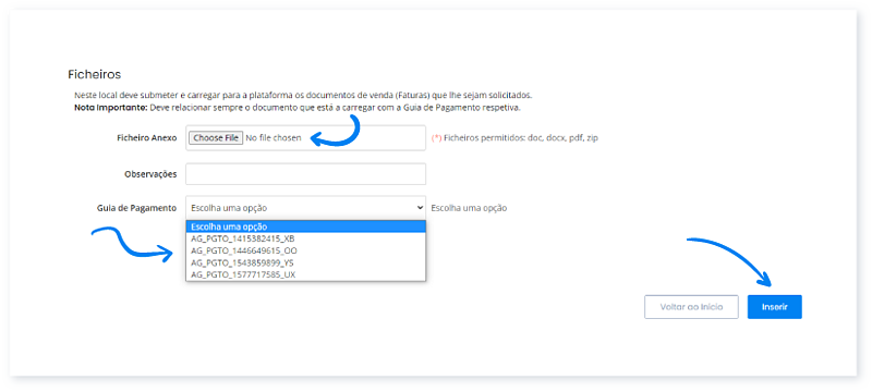 9. Para anexar o seu documento de venda, clique em Escolher ficheiro e em Pagamento associe este documento ao código da Guia referente ao seu pedido. Para terminar clique em Inserir.